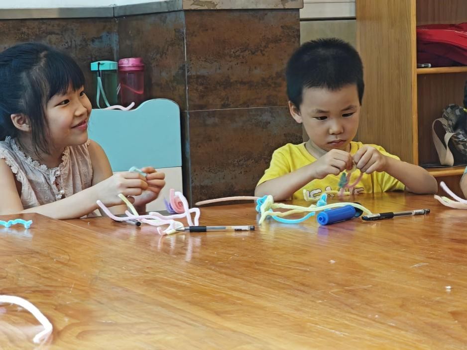 社区课堂安排了篮球、美术、手工制作以及书法课程。课堂中,孩子们在老师的指导下,积极进行实践操作与探索。支教小分队成员穿梭在课堂之中,协助老师管理课堂完成教学,同时积极关注孩子们的状态与需求,为每一位孩子提供帮助。支教过程中,分队成员与孩子们建立了和谐友爱的良好关系。孩子们在这样友好和谐的氛围中,积极动手实践,锻炼体质,不断提高学习能力与操作能力。除了以上的课程,支教过程中还进行了两次课外活动,包括读书分享会以及垃圾分类宣传。这两次活动向孩子们宣传科普了“家风”和“垃圾分类”知识,不仅传授了相关理论知识,还促进了孩子们的品德发展、社会常识建立和精神世界的丰富。