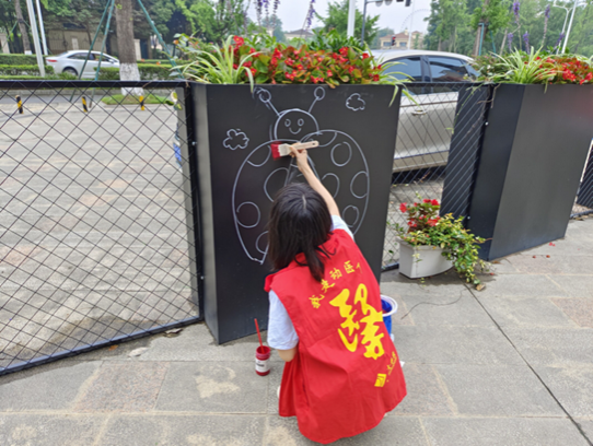 线下调查开始时,天空偶有细雨绵绵,但丝毫未削减志愿者们的热情与决心。他们身着统一的志愿服装,用实际行动诠释了“风雨无阻,志愿同行”的精神。团队成员们用粉笔勾勒轮廓,用画笔轻触色彩。一个个原本平凡的花箱,在志愿者们的巧手下,逐渐焕发出勃勃生机,成为了社区中一道道亮丽的风景线。