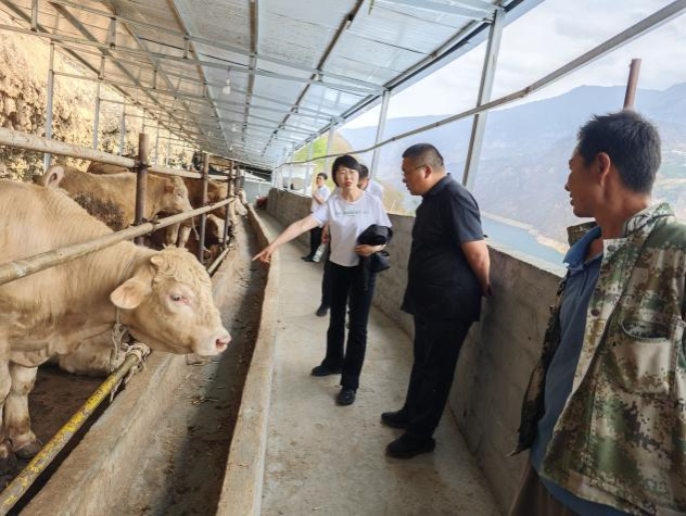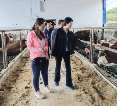 4月16日,专家一行首先在雷波县雷波县教育体育和科学技术局科技股长肖龙仲、王达宾,千万贯乡石板滩村挂职书记韩庆龙等人陪同下走访了汶水镇牛吃水养殖专业合作社、华润五丰汶水生态肉牛养殖基地、千万贯乡石板滩村尹国祥肉牛养殖场。对于专家的到来,汶水镇牛吃水养殖专业合作社负责人苏波期待已久,他的牛场在近期已经将育肥牛全部出栏,正处于批量购买阶段,针对如何购买健康肉牛以及如何平稳度过应激期有较多的疑惑。王娅副教授针对他的问题耐心详细的解答,同时带着养殖技术人员一行走访牛场并手把手教学,指导老乡们如何通过“望、闻、问、切”等基本检查法判断牛儿的健康程度,建议选眼亮有神、鼻镜湿润、嘴大、食欲强、采食量大、四肢粗壮、被毛光亮、体躯长、胸深而宽的肉牛作为育肥牛的购买标准。