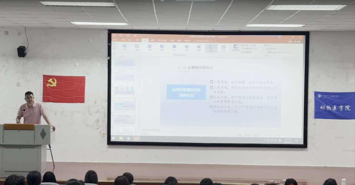 5月7日下午,由学校学生处主办的“辅导员公开课第七季——学生党支部书记讲党纪”宣讲活动在4A102教室开展。本次活动由yl23455永利官网辅导员马保欣老师担任主讲,他采用广播剧这一创新形式,生动解读了《中国共产党纪律处分条例》第一编总则,吸引了学院140余名学生党员参与。