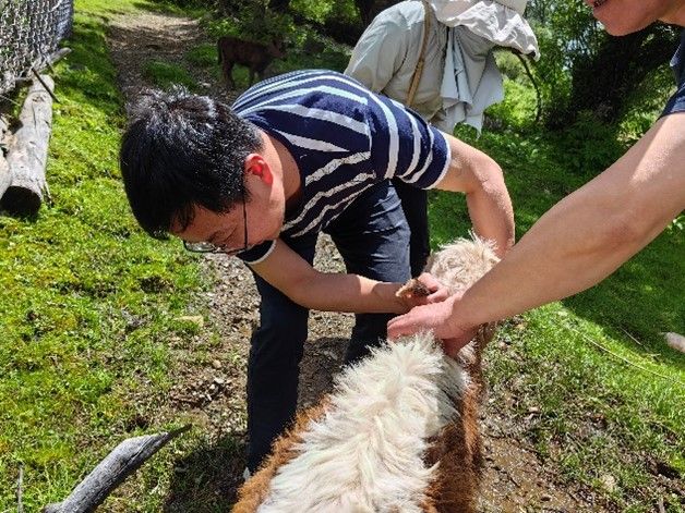7月14日下午,团队一行继续走访当地农民专业合作社、个体养殖户、现场考察草原畜牧业现状。道孚县主要种植燕麦、青稞、油菜等作物,今年雨水较多,肥料被雨水冲走,土地不保肥,导致作物普遍生长不好,青稞存在倒伏的问题;部分草地牧草种植后缺乏管理,导致杂草多,同时地势平,雨后存在积水问题。在道孚县吾卡组,向村级防疫员冬机了解当地肉牛养殖与主要疾病发生情况,该村以养殖黄牛和放牧为主,易感染寄生虫,冬季驱虫技术存在问题等,专家团队就科学驱虫与临床用药技术进行了详细分析及指导。